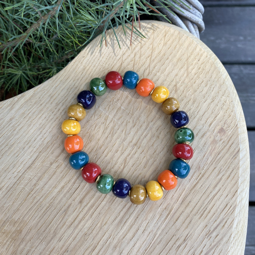 Elastik armbånd med farverige ensfarvede runde keramikperler. Mål: Ca 19 cm.
