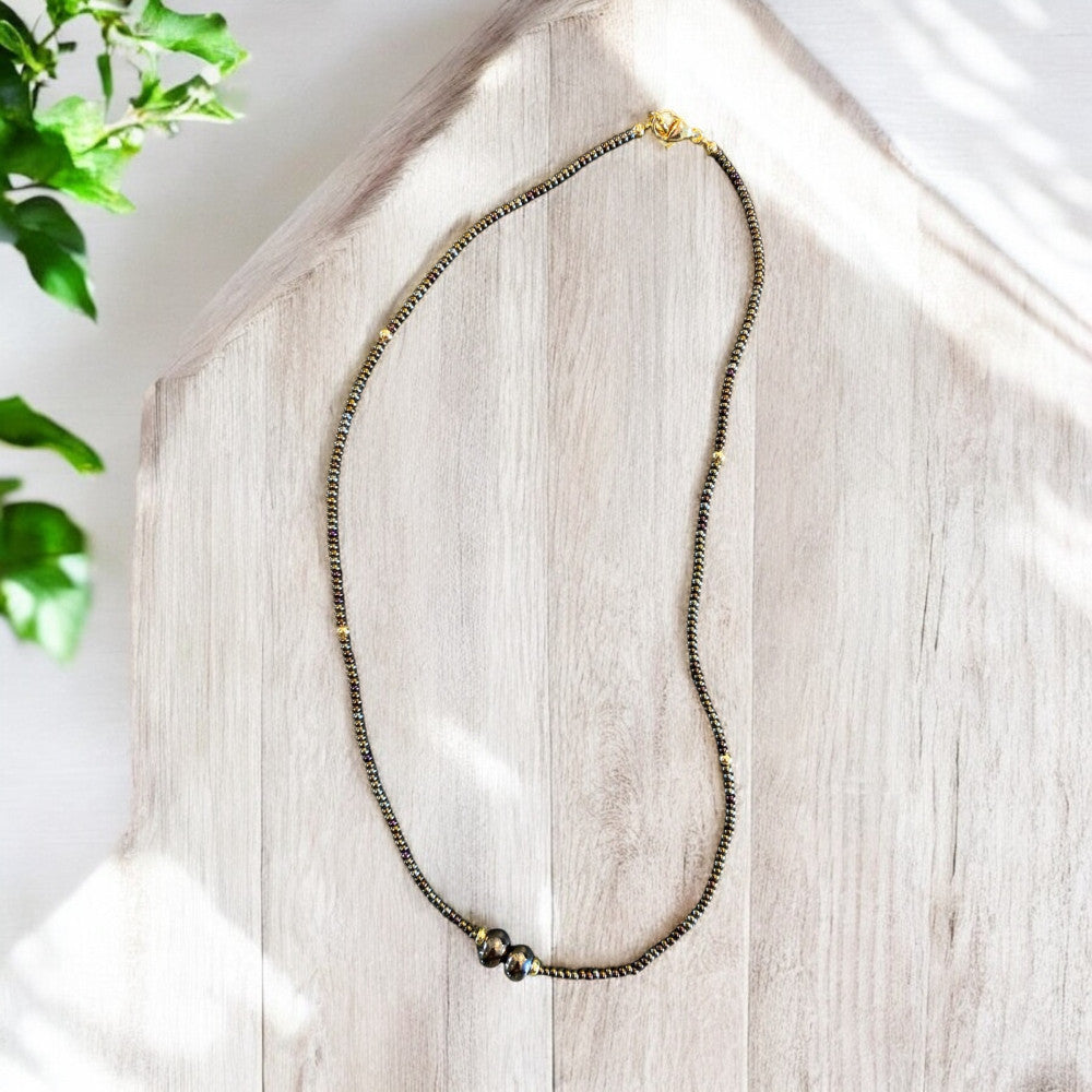 Enkel og let halskæde med gyldne glasperler tilsat 2 små kazuri perler. Mål: Ca 46 cm