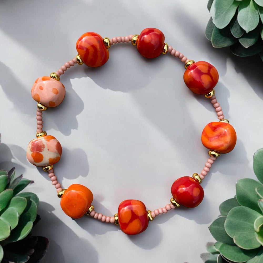 Armbånd med keramikperler, monteret på elastiktråd med glasperler. Ca 19 cm. Orange og korlafarvet