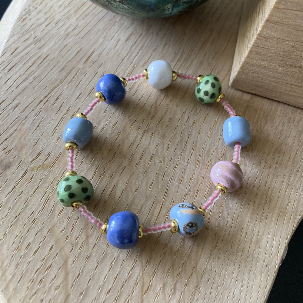 Elastik armbånd med 9 små Keramik perler i forskellige pastel farver og mønstre. Mål: ca 19 cm. Perle str ca 10 mm.