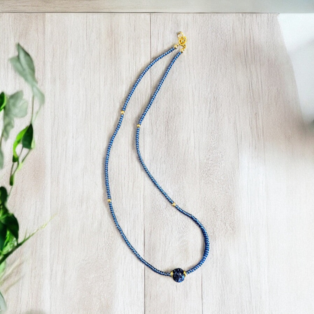 Lille fin halskæde til børn med blå glasperler tilsat en enkelt lille Kazuri perle i blå med mønster. Mål: ca 41 cm.