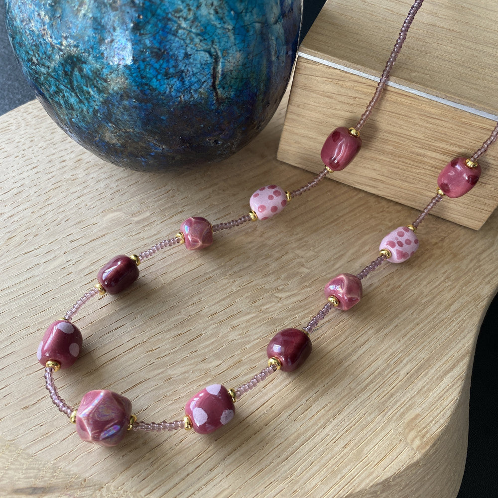 Perlekæde med 11 små keramikperler i rosa og bordeaux farvede glasurer. Længde ca : 60 cm Perle str ca: 11 mm