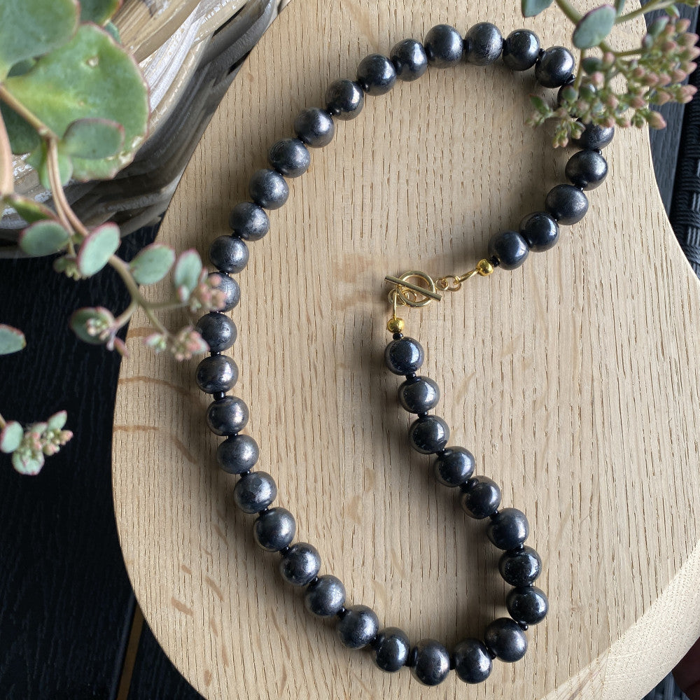 Elegant perlekæde med keramikperler i en mat grå sort glasur. Kæden lukkes med en smuk forgyldt lås. Mål: Ca 48 cm. Perle str ca. 11 mm