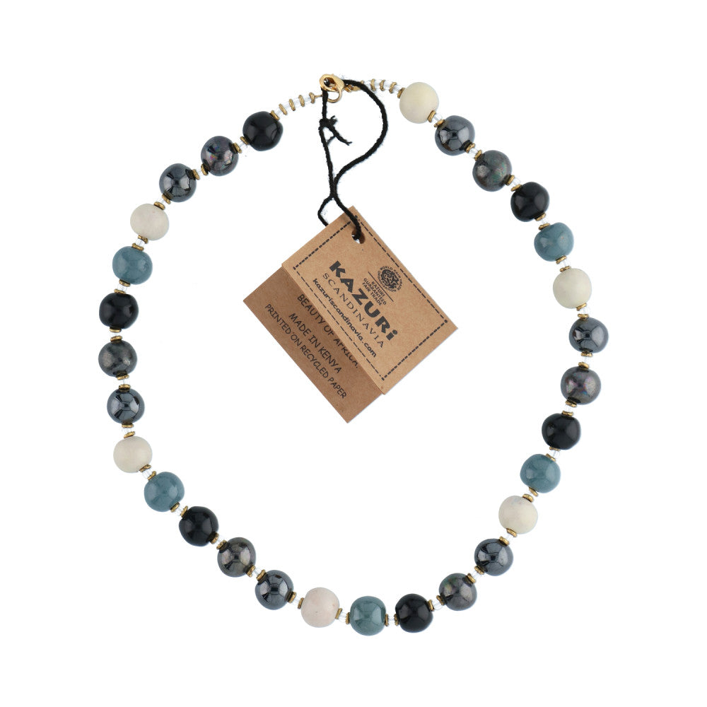 Perlekæde med små runde keramikperler. Ensfarvede sorte, petrol og beige perler. Mål: Ca 48 cm.
