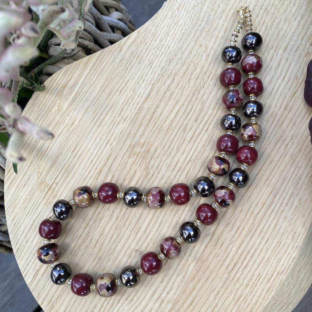 Perlekæde i håndlavede keramik perler. Glaseret i en smuk bordeaux farvede glasur tilført klare gyldne nuancer. Perle str: Ca 12 mm Længde ca 48 cm.