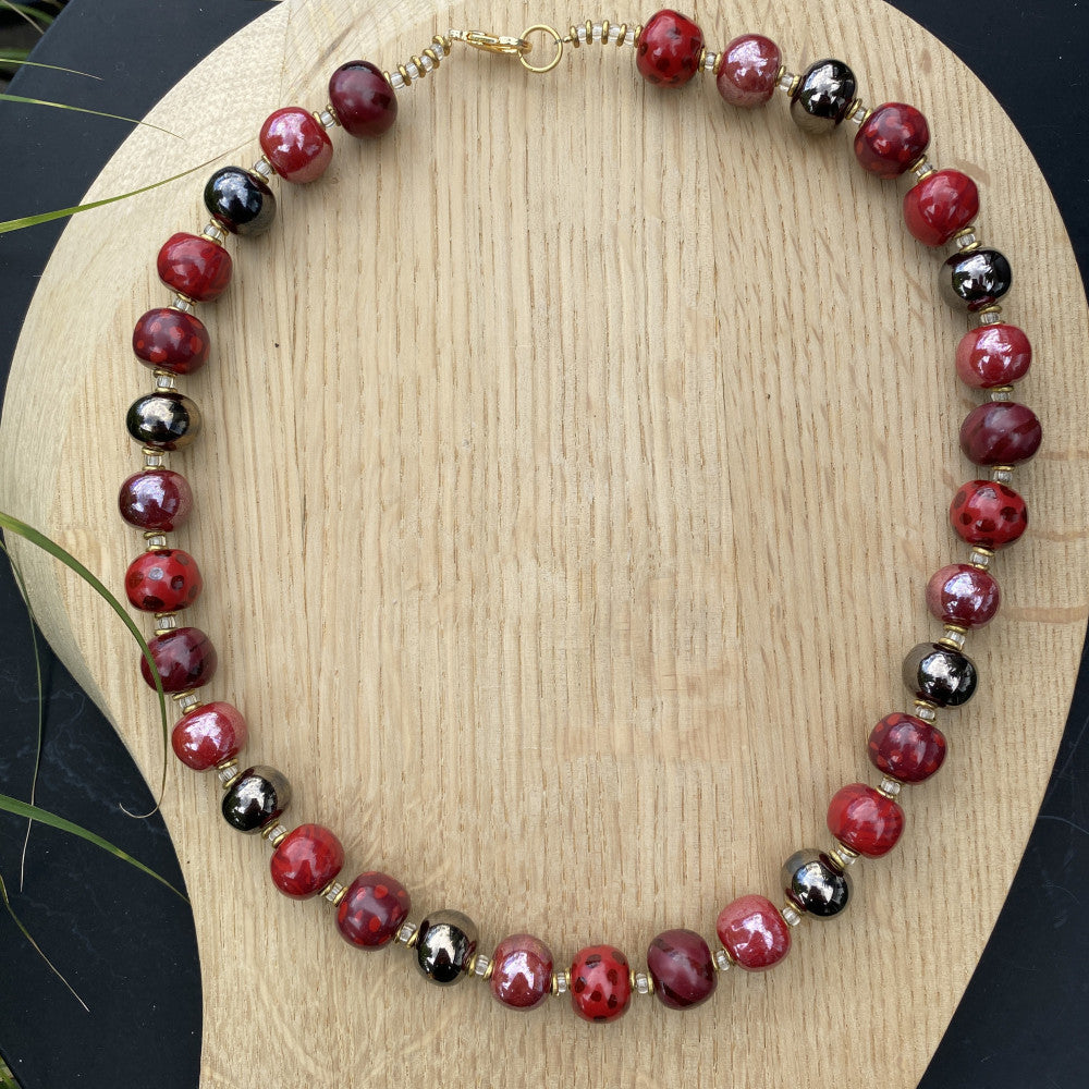 Rød håndlavet keramik perlekæde med afdæmpede mønstre. Der er på enkelte perler tilsat perlemor. Perle str: Ca 12 mm Længde ca: 48 cm