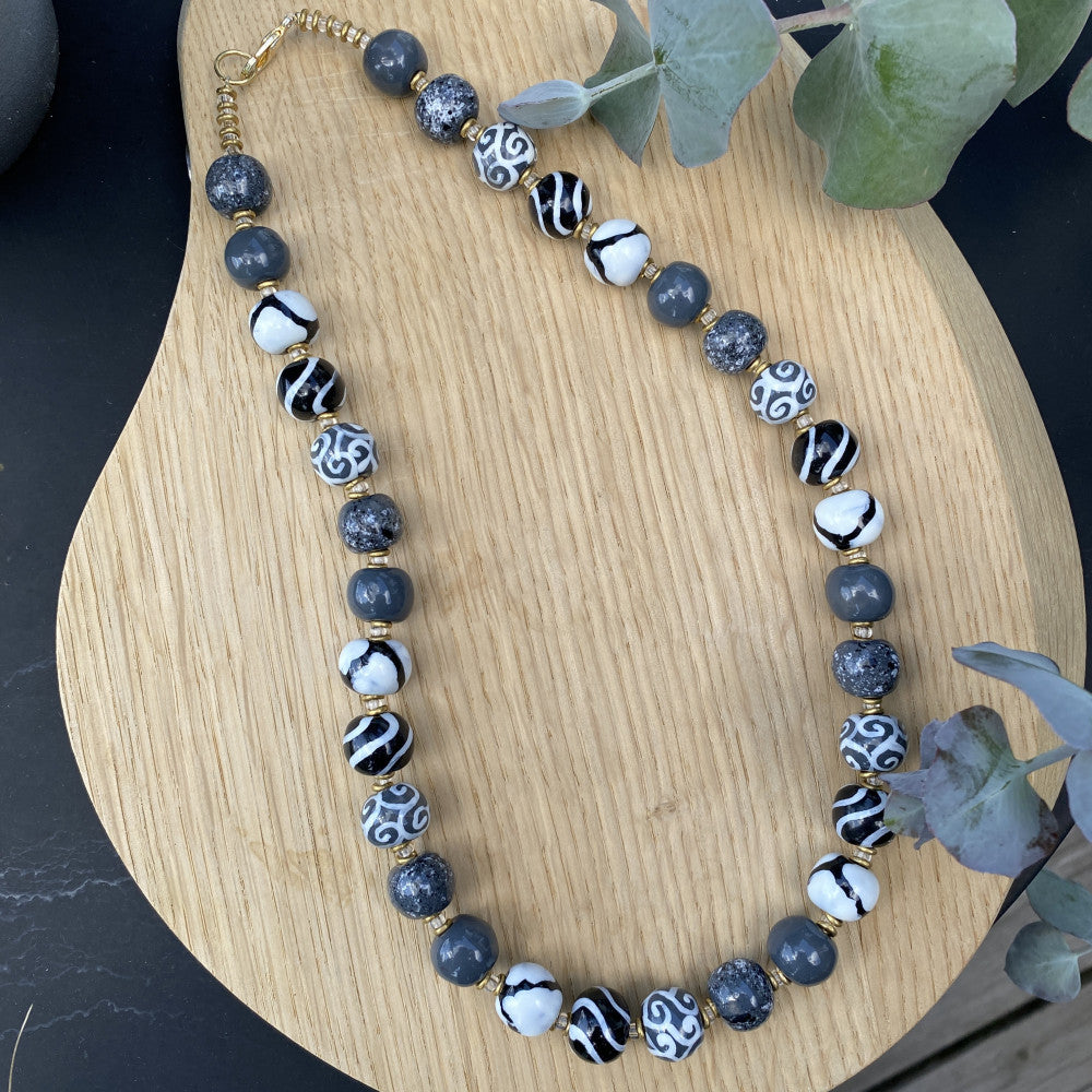 Perlekæde med håndlavede keramikperler. Glaseret med grå, sort og hvidt glasur i afstemte mønstre. Perle str: Ca 12 mm. Længde ca 48 cm.