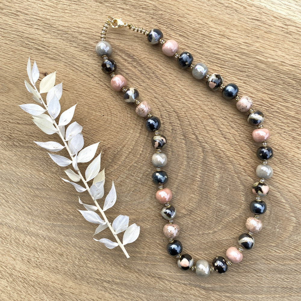 Perlekæde med små runde keramikperler. Gammelrosa glasur og med mørke blanke perler. Mål: Ca 48 cm.