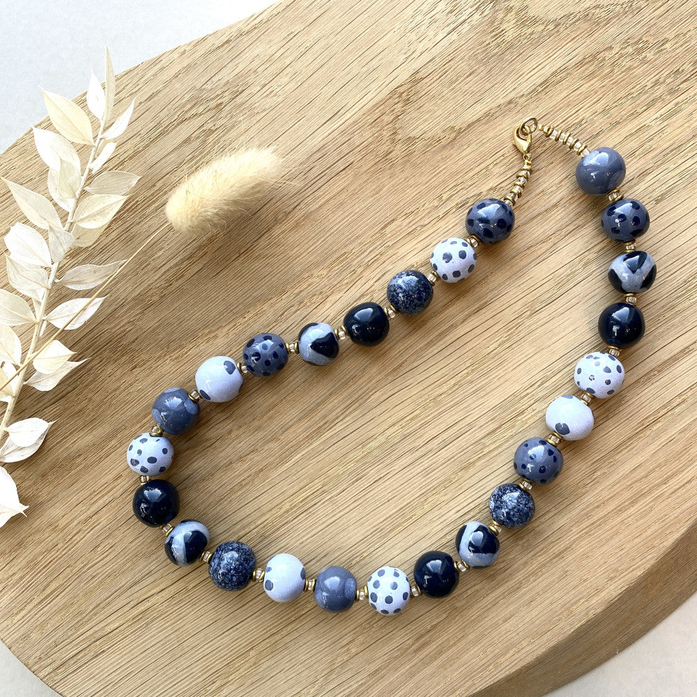 Perlekæde med små runde keramikperler. Et roligt farve mix i blå grå nuancer. Mål: Ca 48 cm