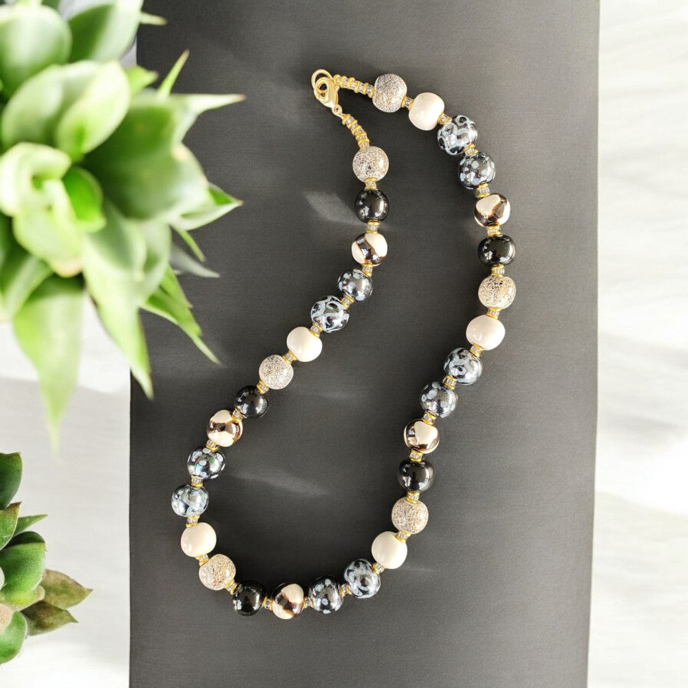 Perlekæde med små keramikperler. Rolige farver i sorte og brune samt lyse nuancer. Mål: Ca. 48 cm