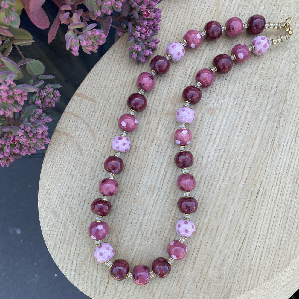 Perlekæde med keramikperler i afdæmpede pink og rosa farver. Alle perler har mønster. Længde ca 48 cm Perle str - ca 12 mm
