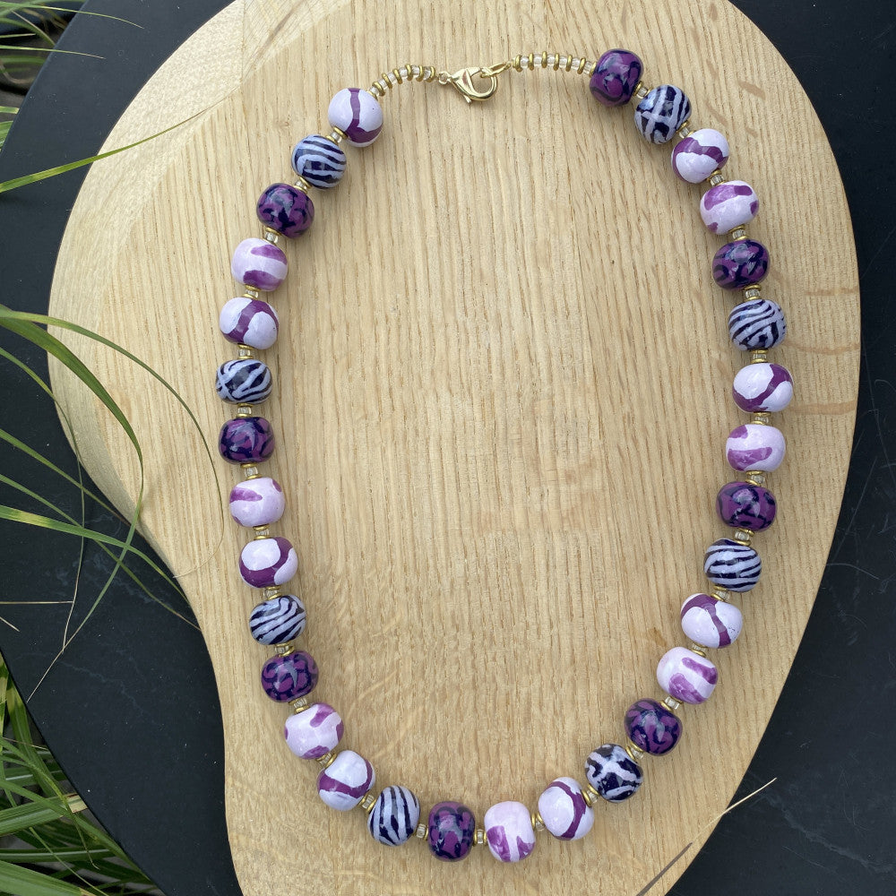 Håndlavet perlekæde i keramik med smukke lilla og violette glasurer. Perle str: Ca 12 mm Længde ca: 48 cm