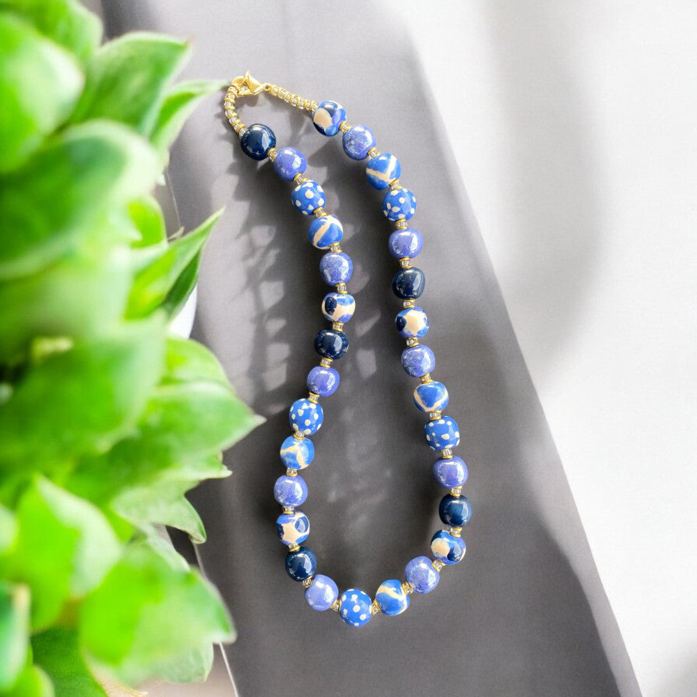 Perlehalskæde lavet af keramik. Skønne blå nuancer i et perfekt match af mønstre. Mål: Ca 48 cm.