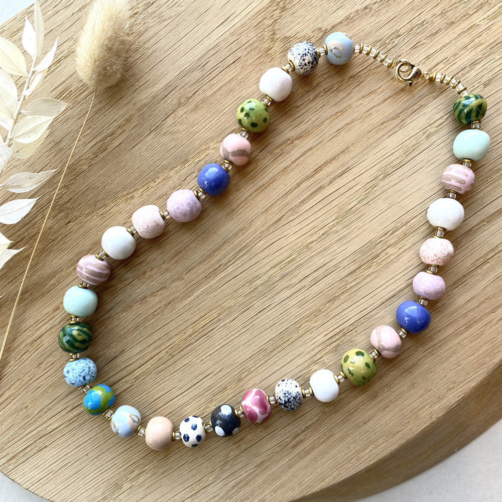 Perlekæde med små runde keramikperler. Søde mønstrede perler i dæmpede pastel farver. Mål: Ca 48 cm.