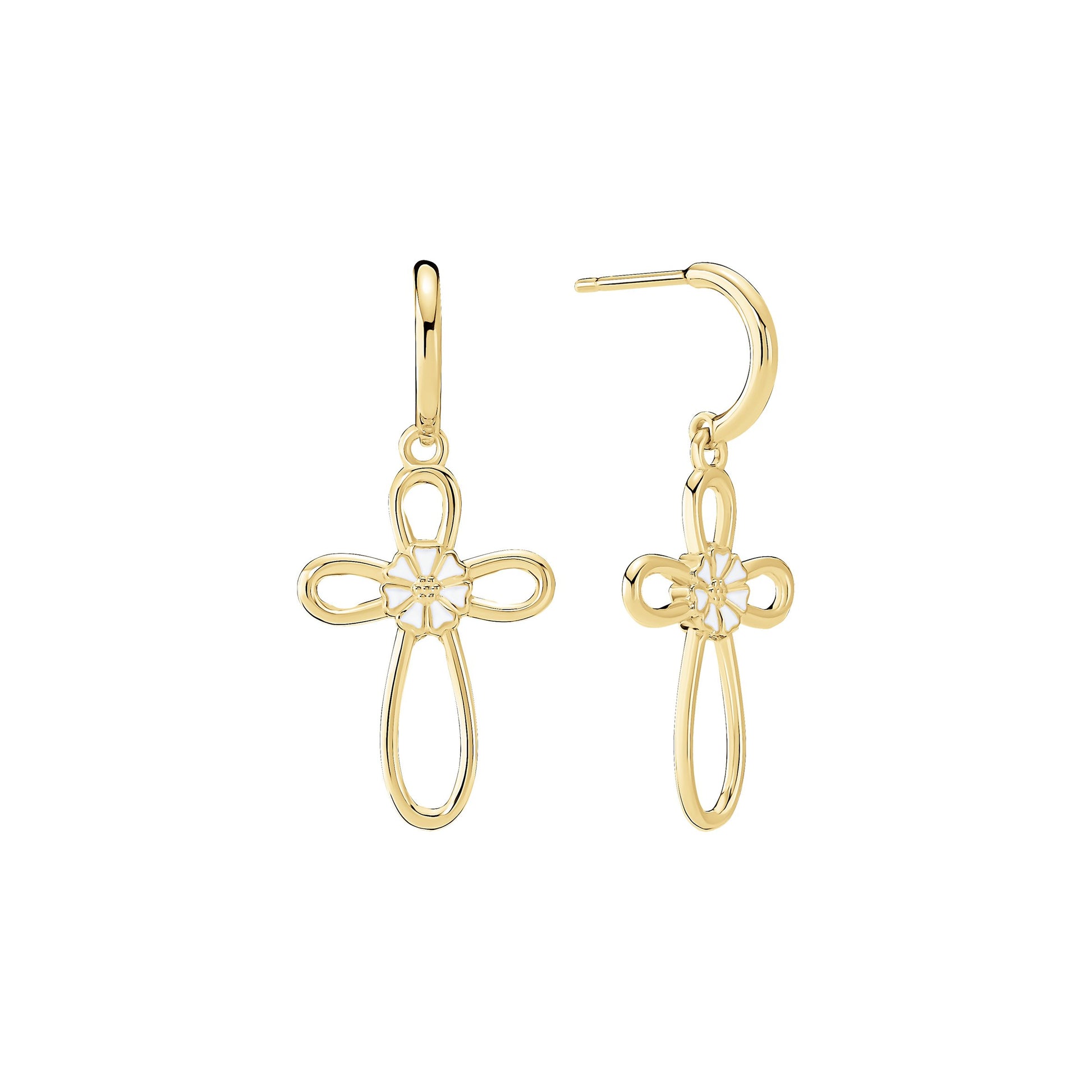 Marguerit ørehænger, kors, 24kt guldbelagt sølv. hvid emalje 925