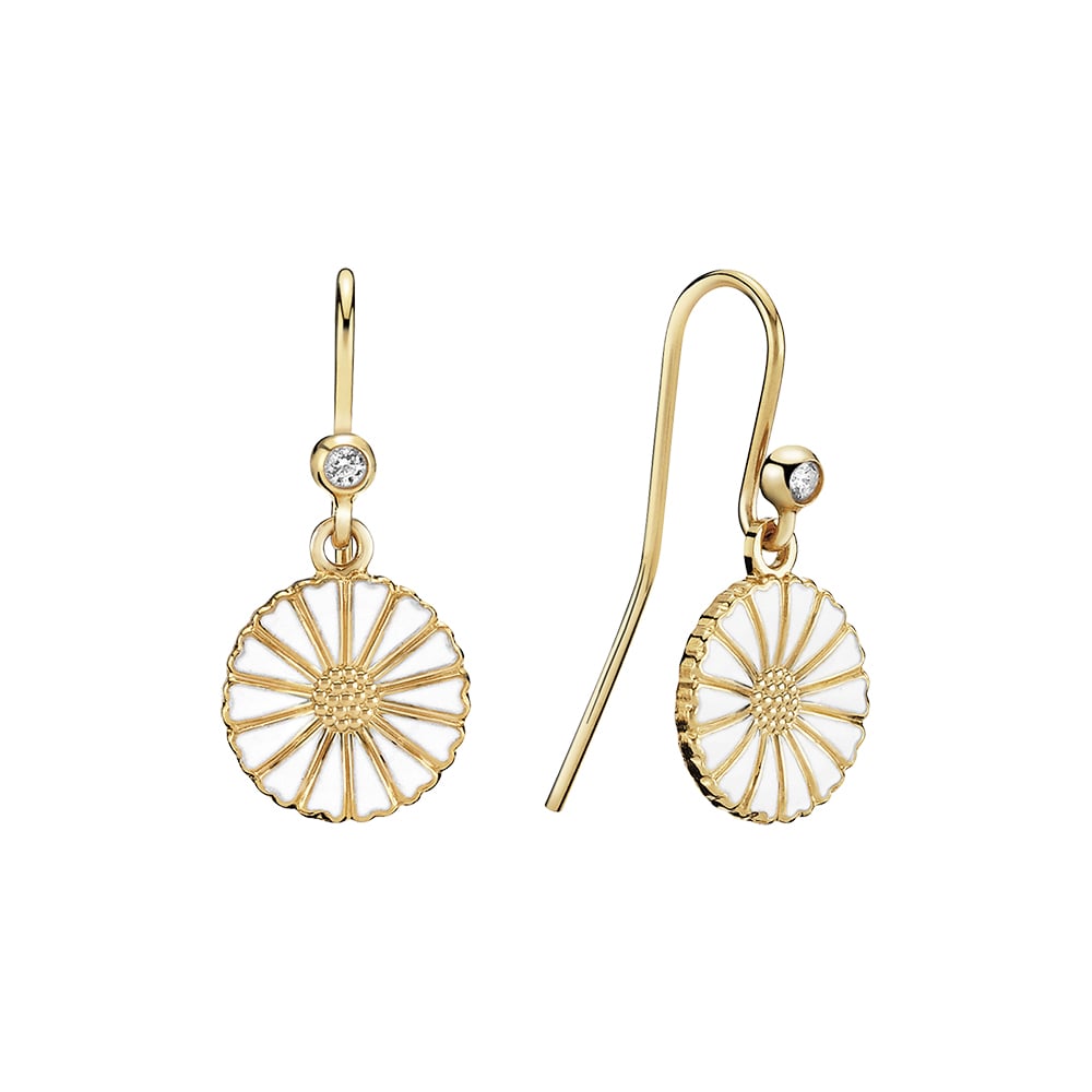 Marguerit ørehænger,med 1 zirkonia 24 kt guldbelagt sølv. hvid emalje 925