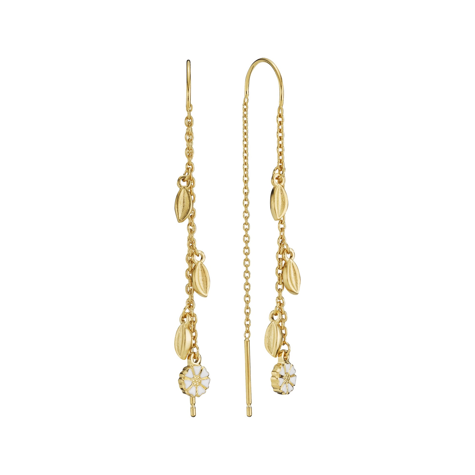 Marguerit ørehænger, med blade 24kt guldbelagt sølv, hvid emalje