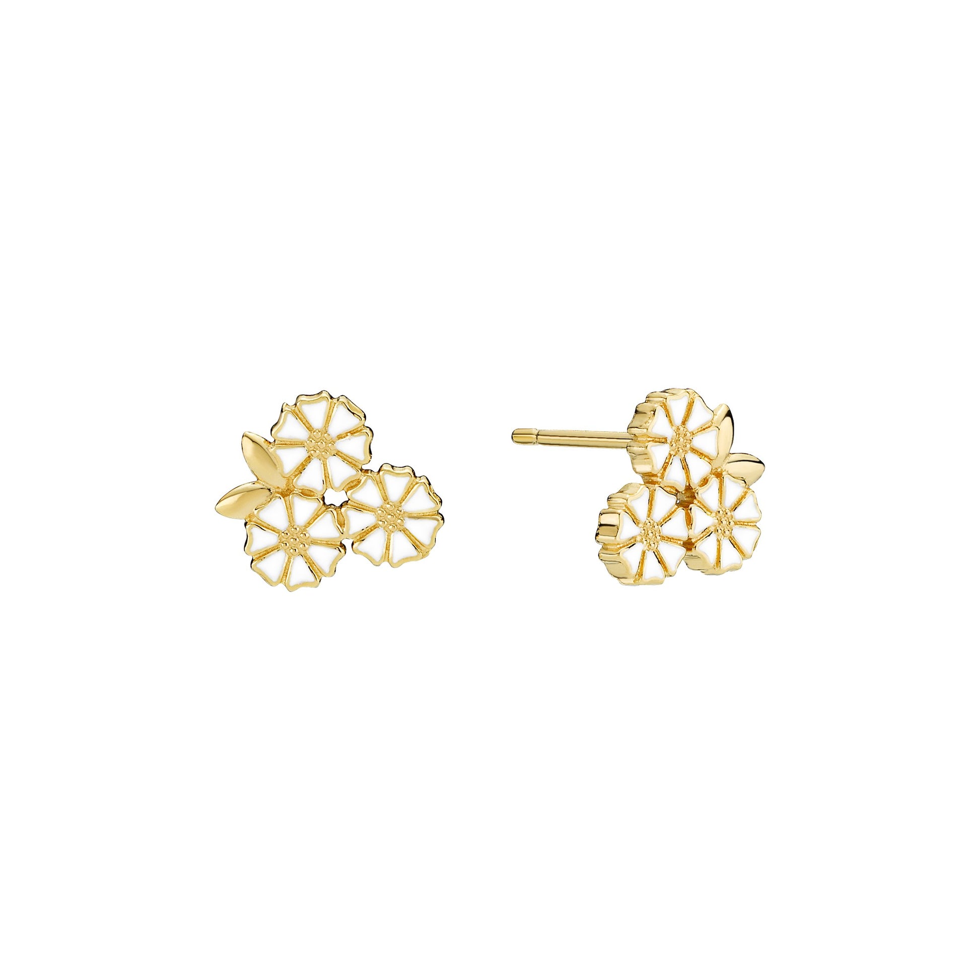 Marguerit ørestik, med blad,24kt guldbelagt sølv, hvid emajle