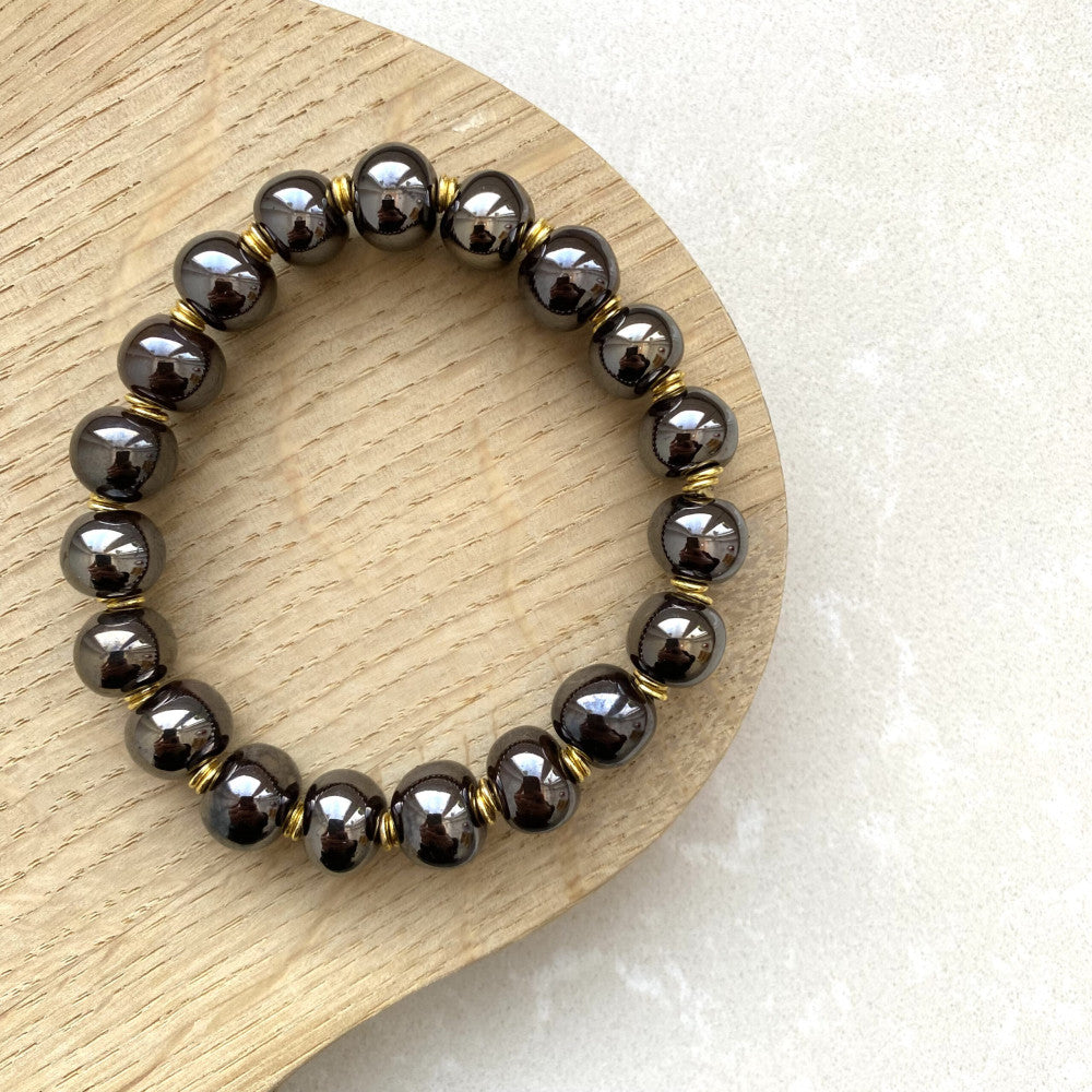 Armbånd med keramikperler, monteret på elastiktråd. Mål: ca 19 cm. Blank antique farvet