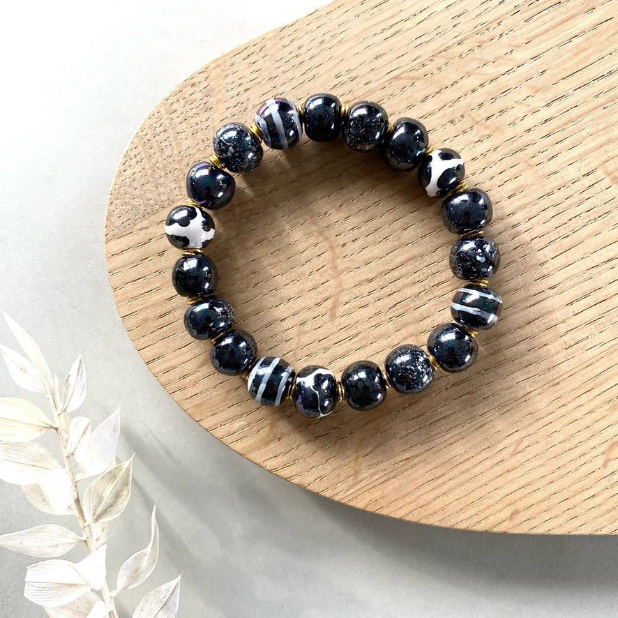 Armbånd med keramikperler, monteret på elastiktråd. Mål: ca 19 cm. Sort og hvid med perlemor