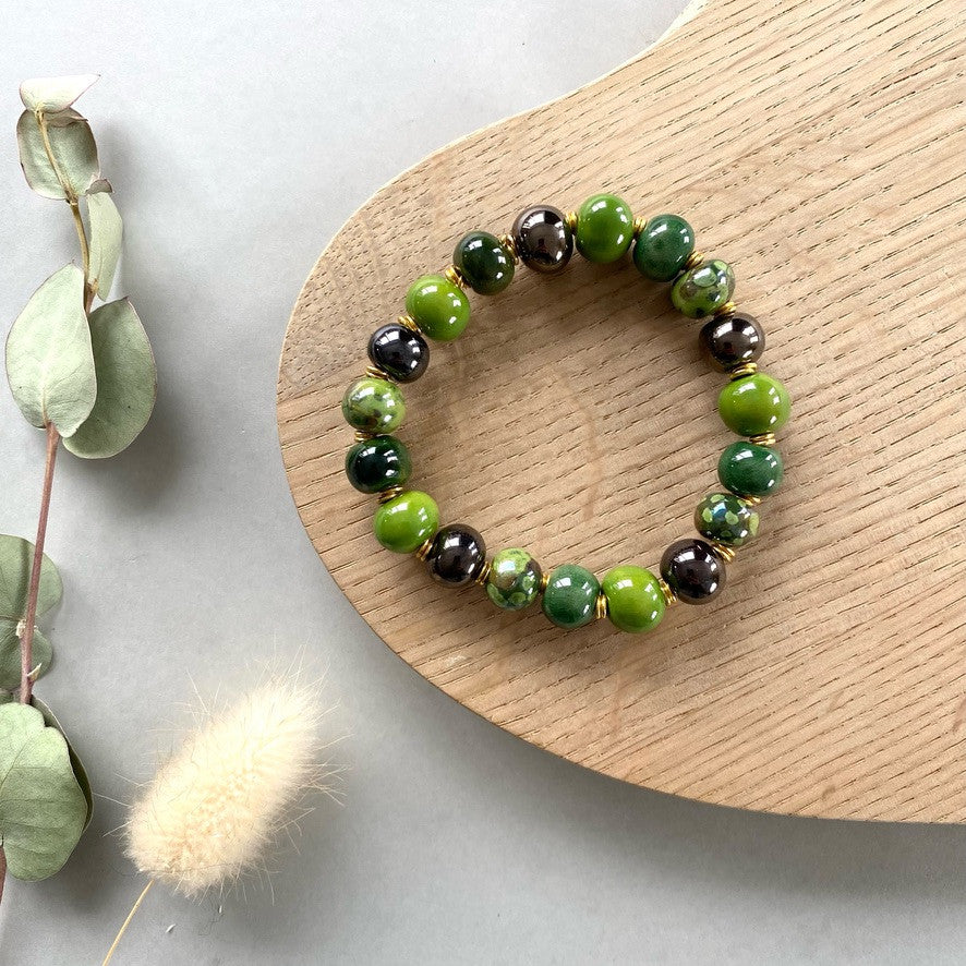 Armbånd med keramikperler, monteret på elastiktråd. Mål: ca 19 cm. Klare grønne farver med perlemor