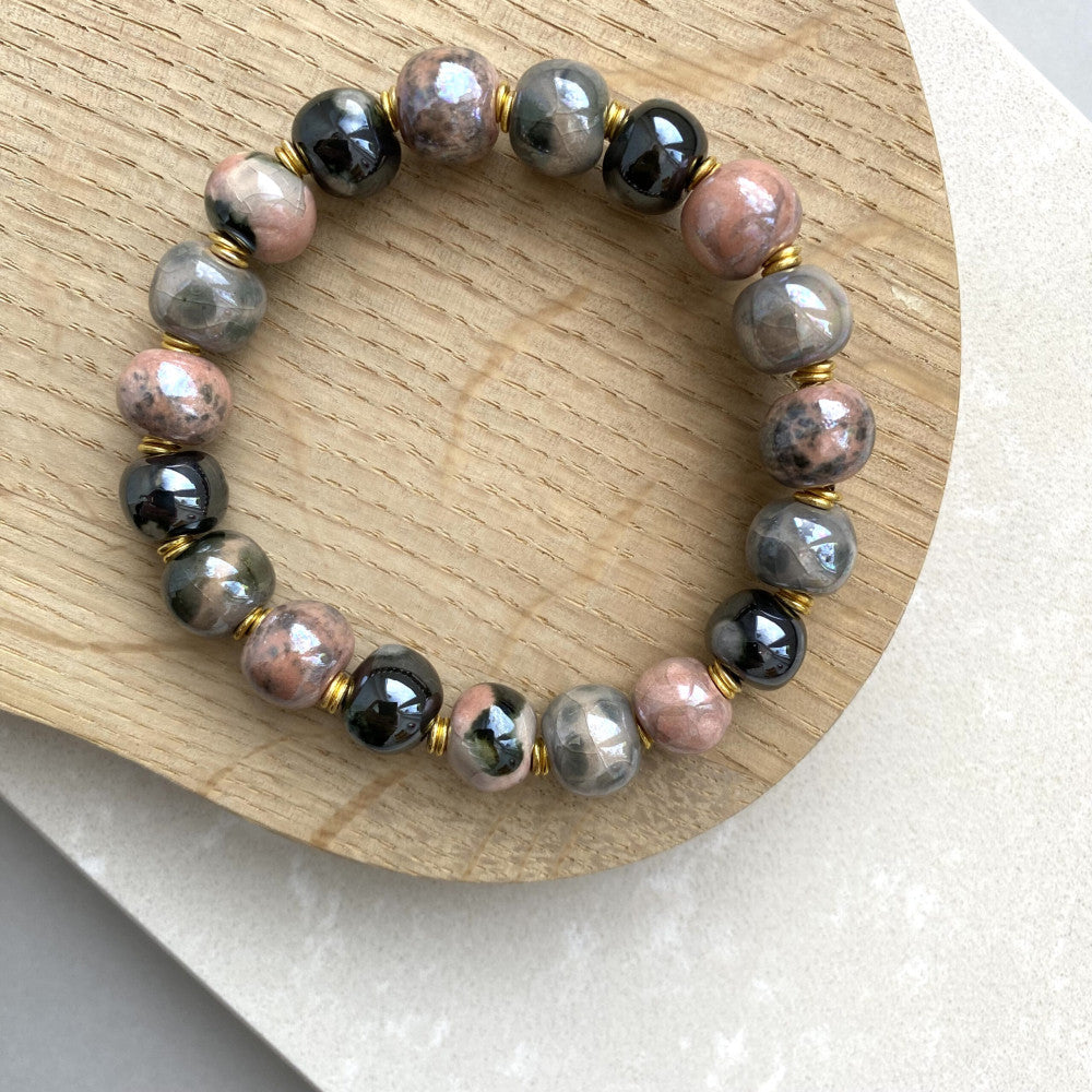 Armbånd med keramikperler, monteret på elastiktråd. Mål: ca 19 cm. Skønne dæmpede rosa mix farver. med perlemor