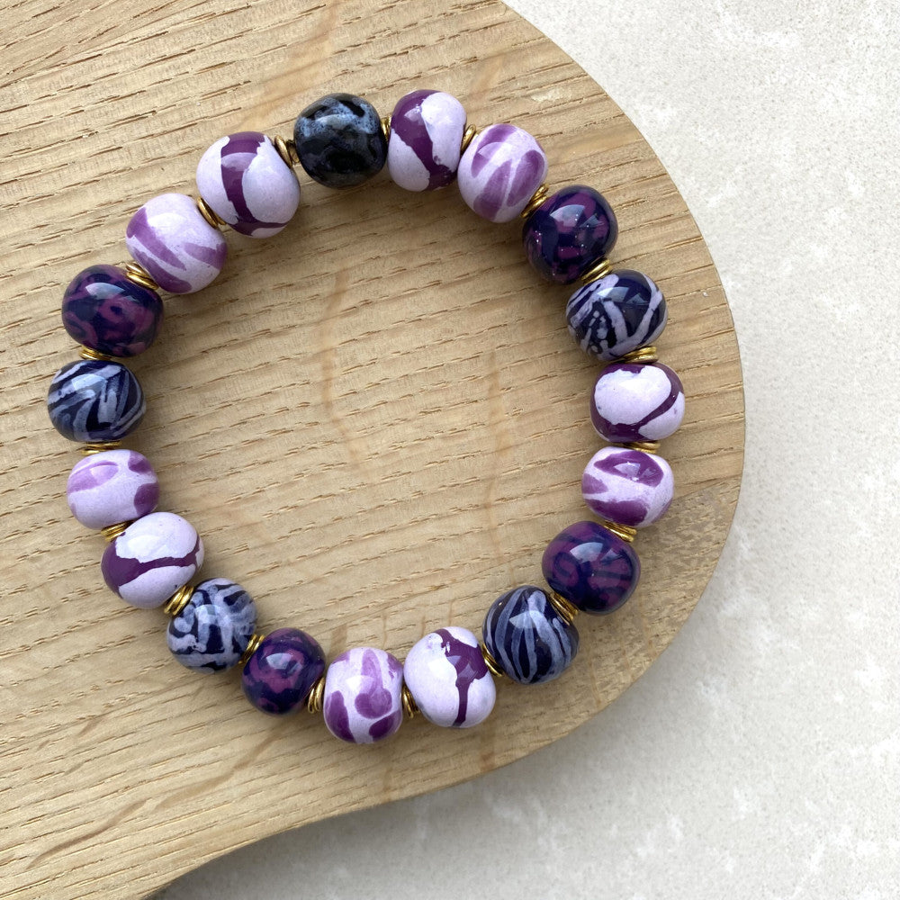 Armbånd med keramikperler, monteret på elastiktråd. Mål: ca 19 cm. Smukke lilla farver, med et strejf af hvidt