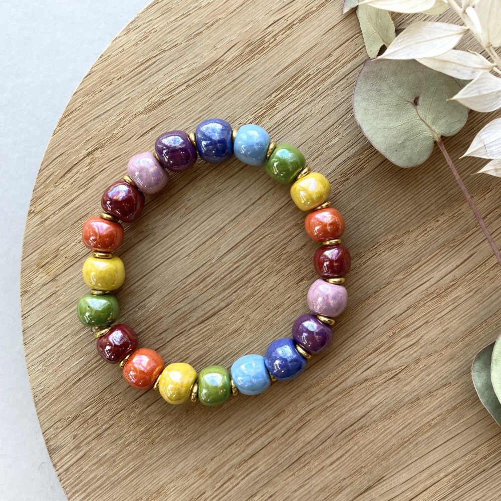 Armbånd med keramikperler, monteret på elastiktråd. Mål: ca 19 cm. Regnbuefarver med perlemor