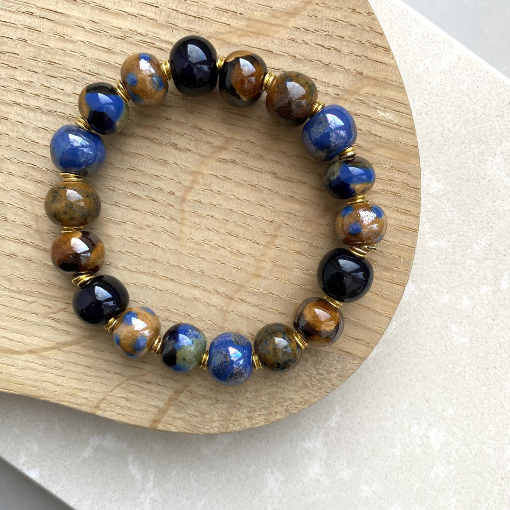 Armbånd med keramikperler, monteret på elastiktråd. Mål: ca 19 cm. Brun og blå med perlemor