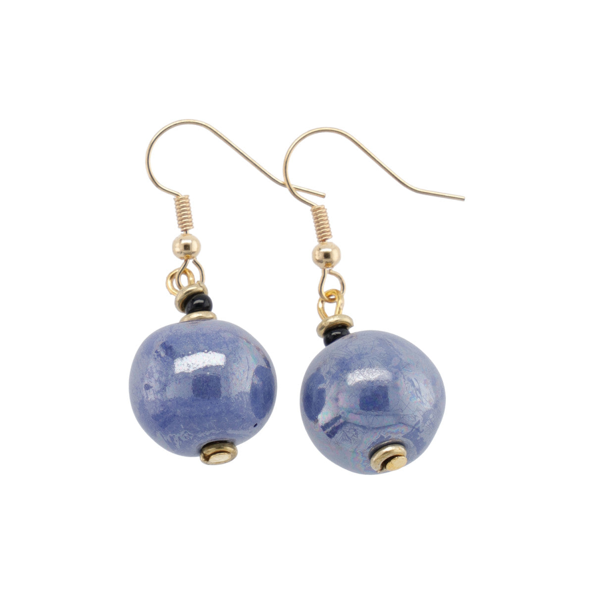 Hænge øreringe med runde perler i smuk blå lilla farve med perlemor. Perle str: Ca 10 mm.