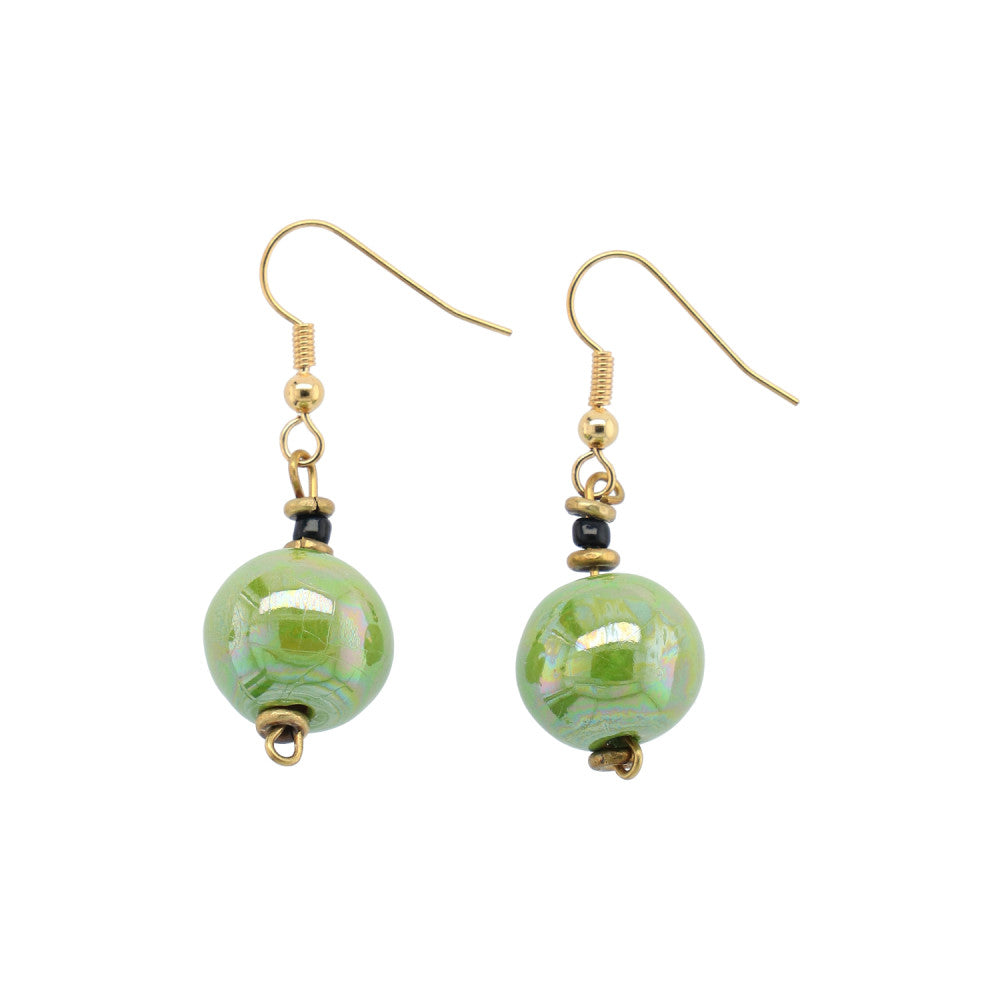 Smukke keramik øreringe i lysgrøn med perlemor som matcher ethvert outfit. ( sæt a´ 2 stk ) Perle str: Ca 10 mm.