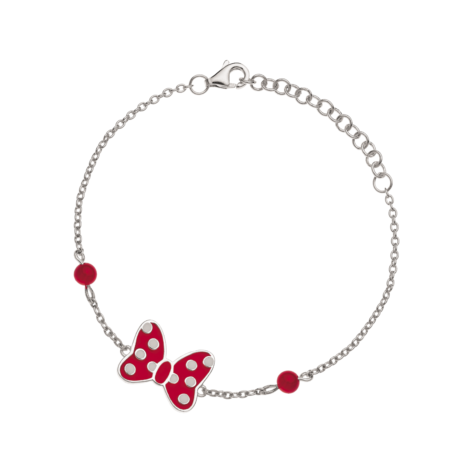 Sølv armbånd Minnie Mouse med rød sløjfe med hvide prikker.