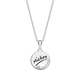 Sølv halskæde cirkel med Mickey Mouse - tekst mickey på bagside.