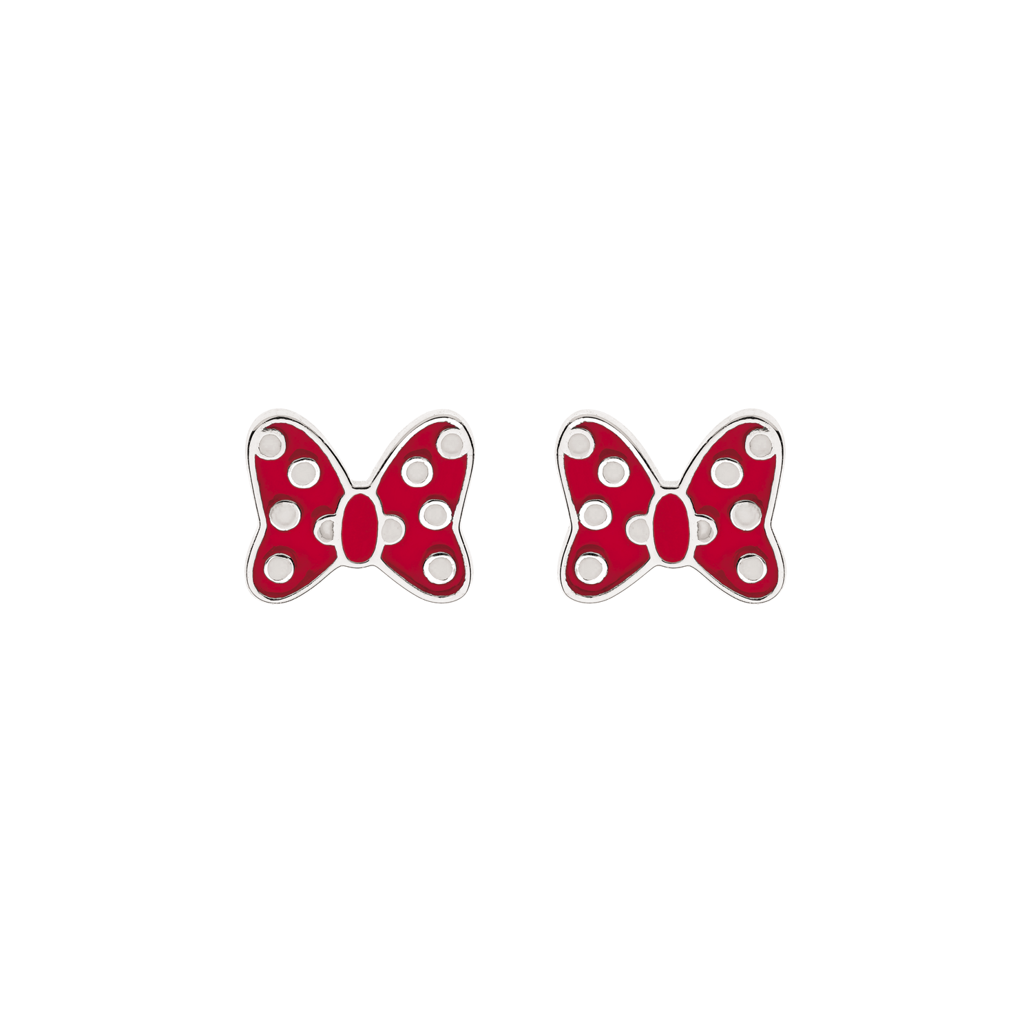Sølv ørestikker Minnie Mouse med rød sløjfe med hvide prikker.