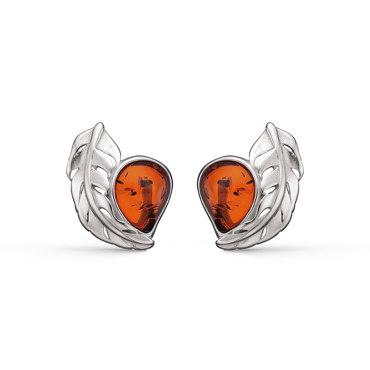 Sølv ørestikker rhodineret dråbe i rav med blad i den ene side