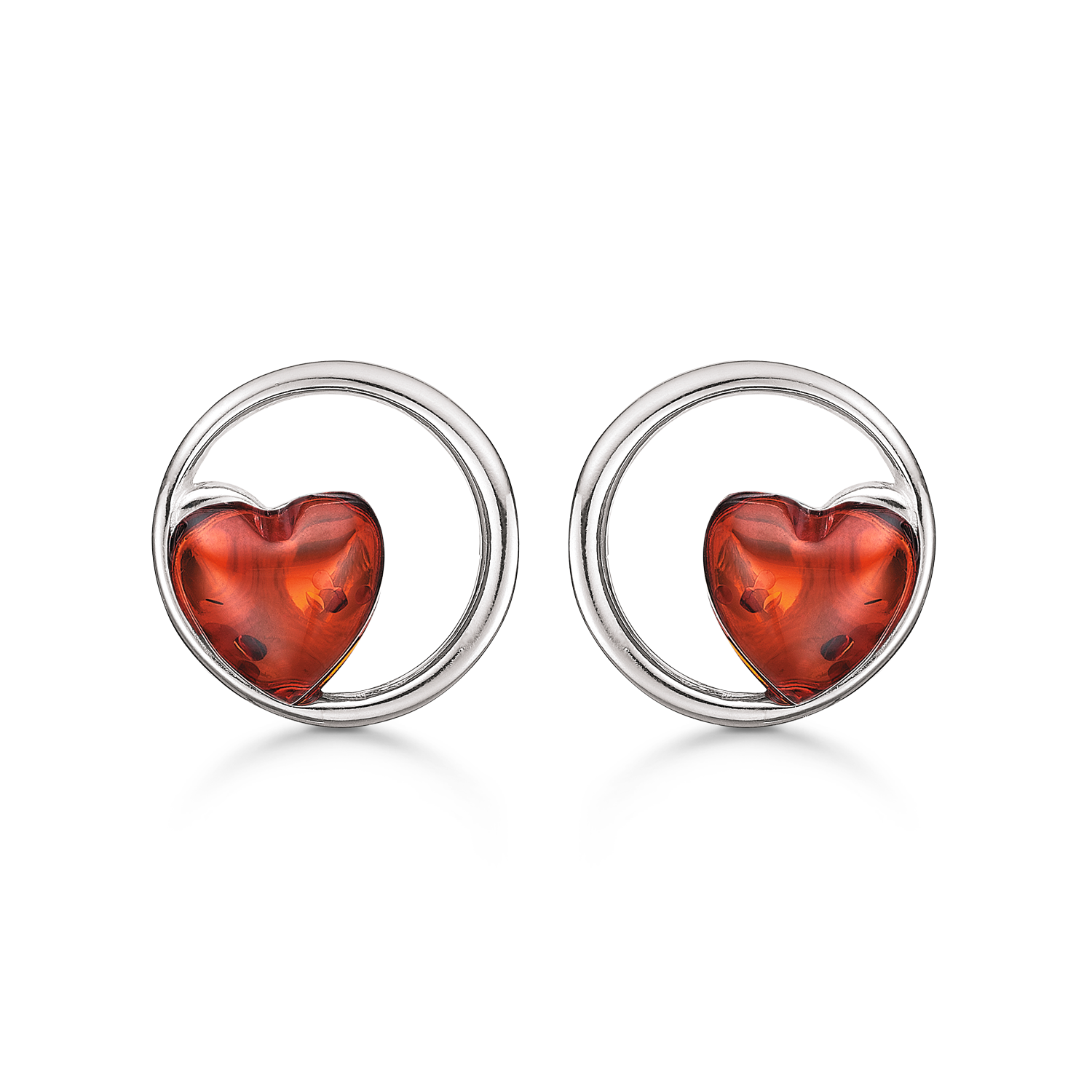 Sølv ørestikker rhodineret hjerte med rav i cirkel