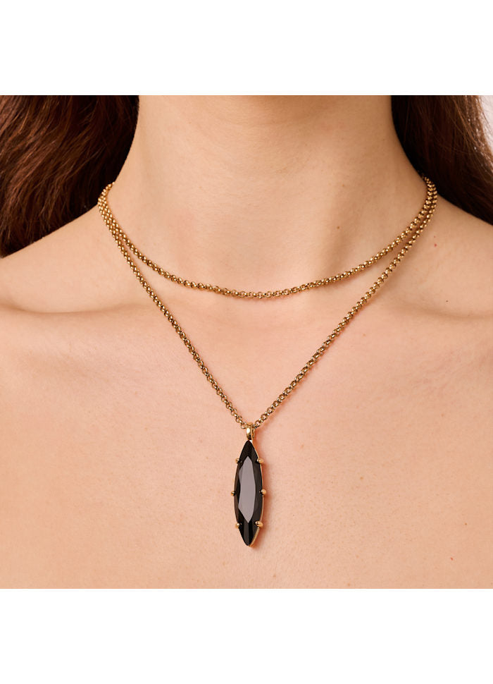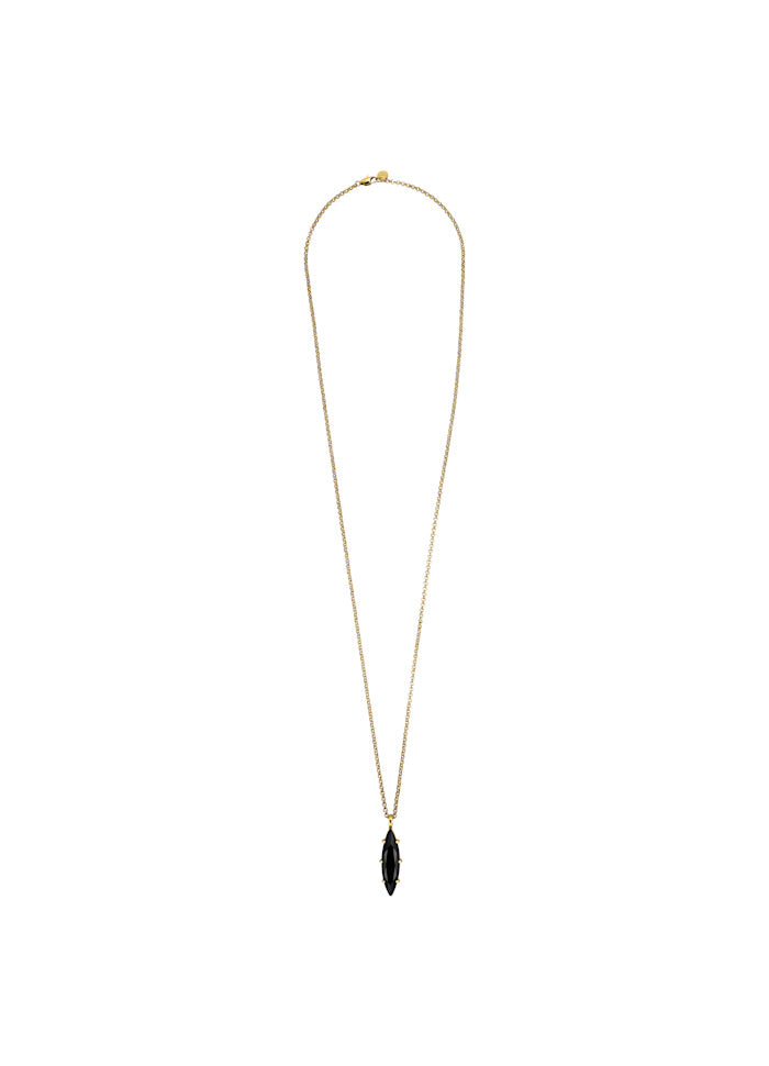 TAKESHI is the name of this simple yet über cool long necklace of a total of 80 cm. Fitted with small steel lobster clasp, and a super elegant, sleek leaf-shaped faceted glittering crystal, and set in a classic jewel setting. This neck piece of jewellery is sure to attract attention. This version is designed in gold-toned brass and a jet black stone. Nickel-free Danish design - from DYRBERG KERN.