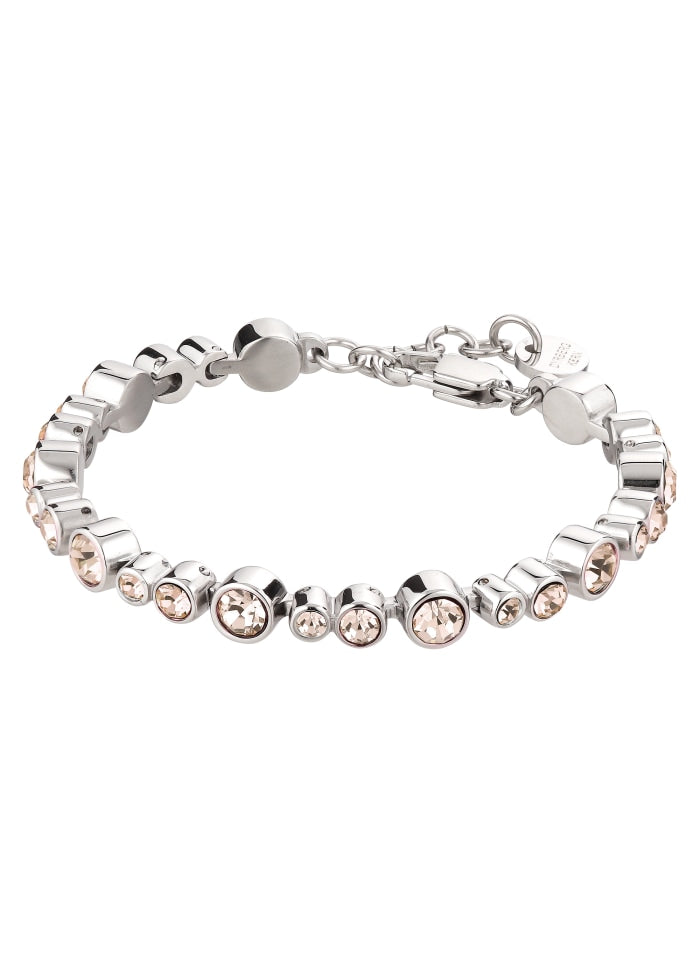 TERESIA is a feminine and chic bracelet made with a row of crystals in various sizes for an irregular look.Made in stainless steel and plated and polished to perfection. Here shown in cool urban combination of dry desert sandy tones on silver tone finish. Length 17 cm + extension. DANISH DESIGN - free of cadmium, lead and nickel.