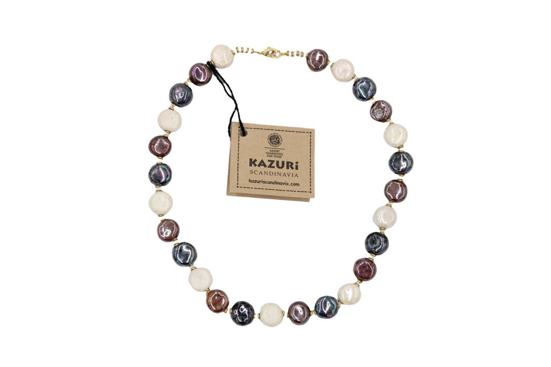 Keramik perlekæde med små halvflade perler. En kombination af beige og vinrød ensfarvede perler tilført perlemor. Mål: Ca 48 cm.