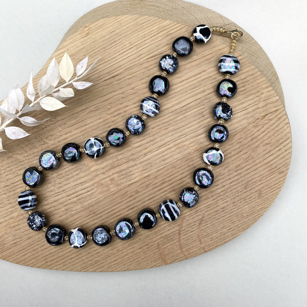 Keramik perlekæde med små halvflade perler. Sort og hvid med mønster og perlemor. Mål: Ca 48 cm.