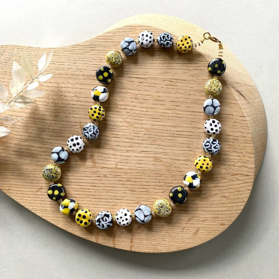 Keramik perlekæde med små halvflade perler. En kombination af gul, sort og hvid. Mål: Ca 48 cm.