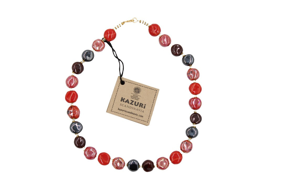 Keramik perlekæde med små halvflade perler. Smukke røde nuancer. Mål: Ca 48 cm.