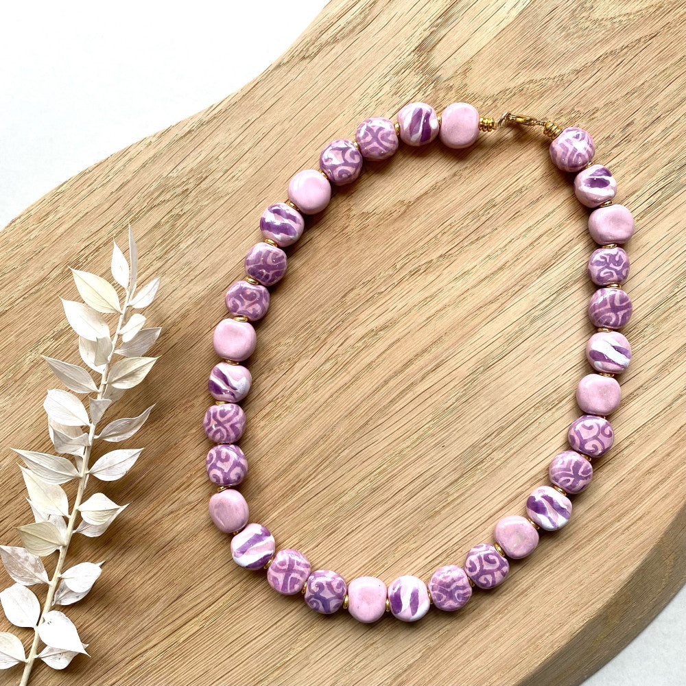 Keramik perlekæde med små halvflade perler. Rosa mønstret og med perlemor. Mål: Ca 48 cm.