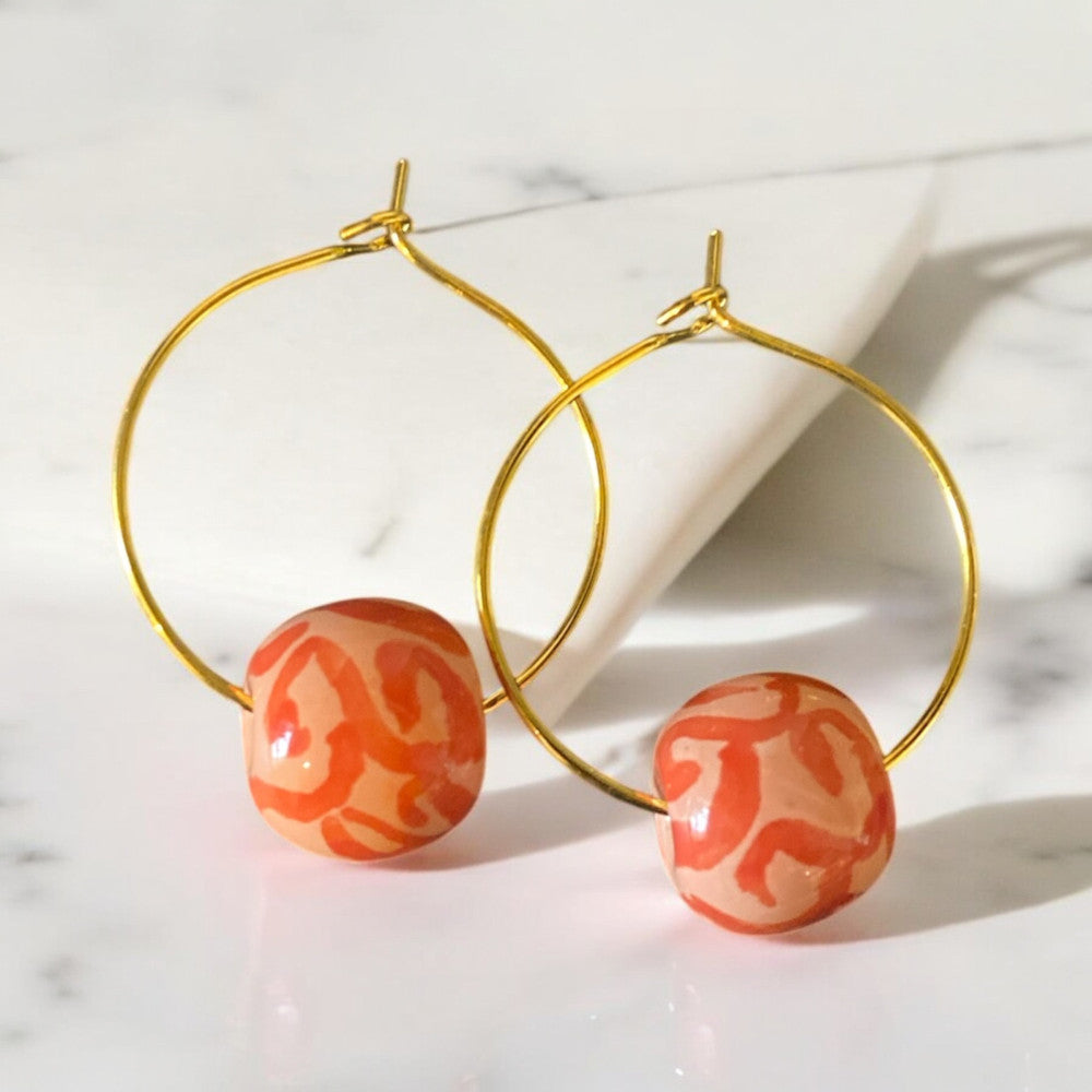 Koral orange glasur med lyst mønster. Alle Kazuri perler er håndlavet af lokalt ler fra Kenya og efterfølgende malet i hånden. Perlen måler cirka 1 cm i diam. Creol = 2,5 cm = forgyldt