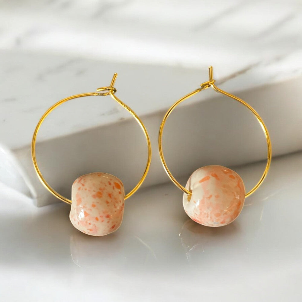 Koral farvet glasur med orange splash. Alle Kazuri perler er håndlavet af lokalt ler fra Kenya og efterfølgende malet i hånden. Perlen måler cirka 1 cm i diam. Creol = 2,5 cm = forgyldt
