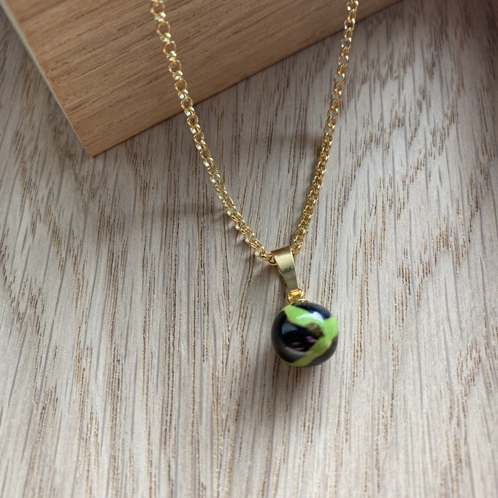 Vedhæng i sølv/925 med grøn og sort glaseret kazuri-perle, malet med girafmønster. Håndlavet og unikt – perfekt til din halskæde. Perle str: Ca 10 mm (Kæde medfølger ikke)