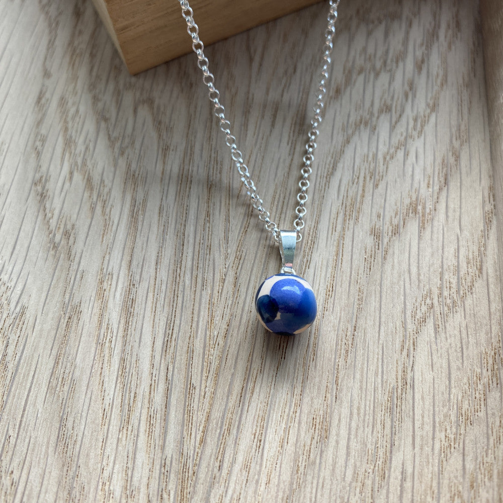 Vedhæng i sølv/925 med blå og hvid mønstret kazuri-perle. Håndlavet og unikt – perfekt til din halskæde. Perle str: Ca 10 mm (Kæde medfølger ikke)