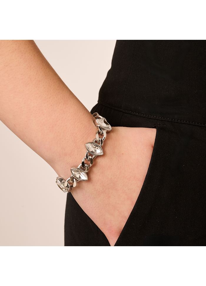 ZELKO is our version of the luxurious chain bracelet, with its solid steel chain and the inserted five navette shaped faceted crystals that are just super impactful. The length is 17 cm + extension chain. Wear it alone, or mixed with other bracelets. Here shown in silver toned and a beautiful and classic white crystal. Designed in Denmark and free from cadmium, nickel and lead.